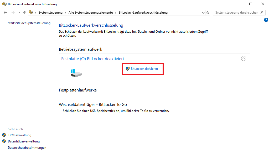 Wenn Sie die Verschlüsselung in den Einstellungen nicht finden können, können Sie zu folgenden Punkten navigieren: Systemsteuerung > Alle Systemsteuerungselemente > BitLocker-Laufwerksverschlüsselung > BitLocker aktivieren.