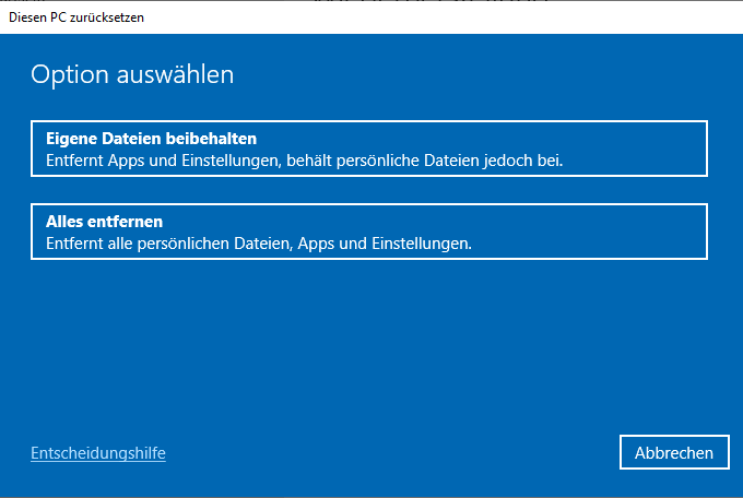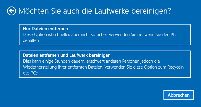 Beim Zurücksetzen auf die Werkseinstellungen werden Ihre Einstellungen und Treiber auf die Standardwerte zurückgesetzt. Alle Ihre Anwendungen und Daten werden gelöscht. Sie können wählen, ob Sie Ihre persönlichen Daten behalten oder alle persönlichen Dateien, Anwendungen und Einstellungen löschen möchten.