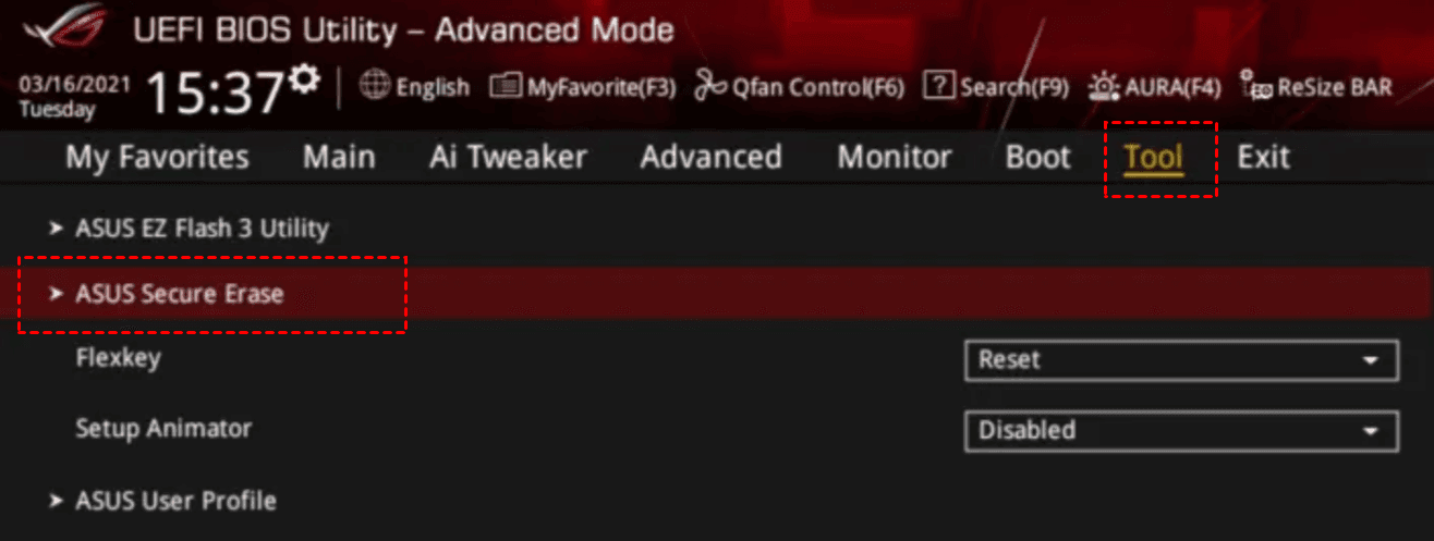 - Starten Sie Ihren Computer neu. Wenn das ASUS-Logo auf dem Bildschirm angezeigt wird, drücken Sie die Löschen-Taste, um das BIOS zu betreten, und klicken Sie dann im Advanced Mode-Menü auf Tool > ASUS Secure Erase.