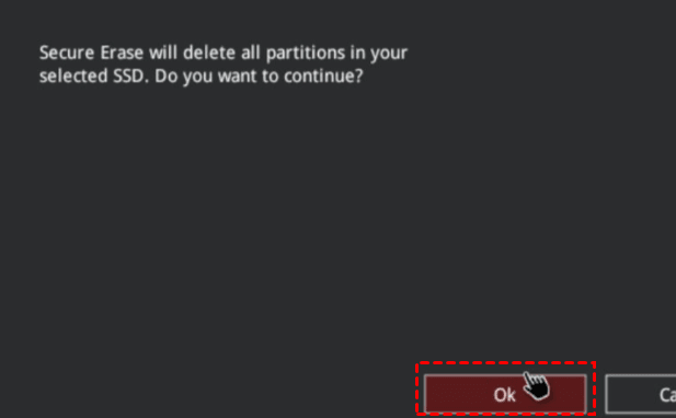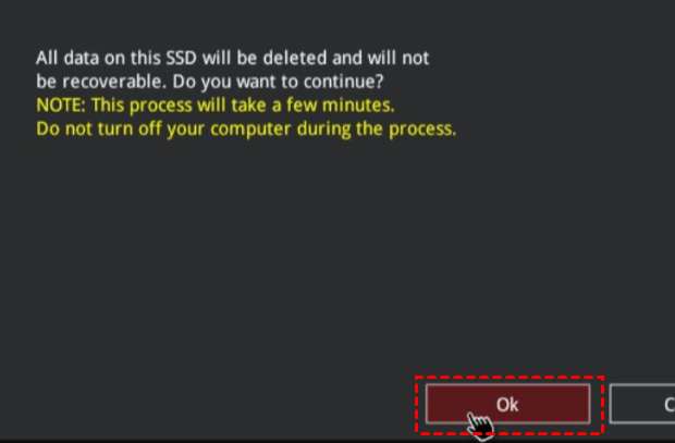 - Anschließend wird eine Warnmeldung angezeigt, die besagt, dass „Secure Erase will delete all partitions in your selected SSD“. Klicken Sie auf OK, um fortzufahren.