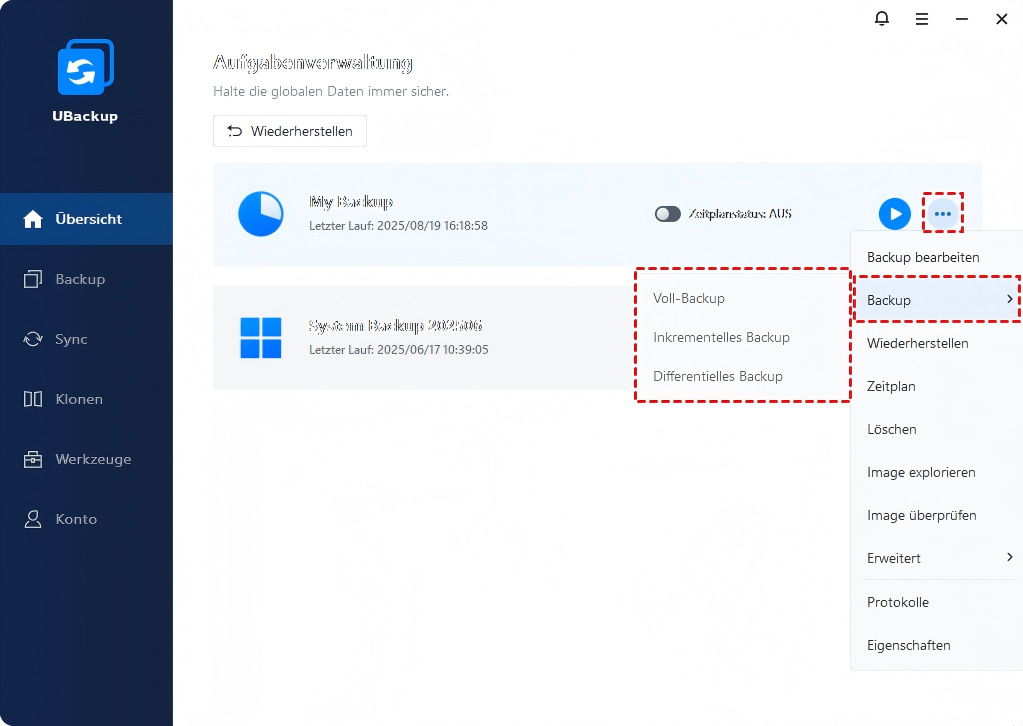* Wenn bereits eine vollständige Sicherungsaufgabe vorhanden ist, können Sie sie so einrichten, dass nur geänderte Dateien auf der Registerkarte „Übersicht“ gesichert werden. Klicken Sie einfach auf Backup und wählen Sie Inkrementelles Backup/Differentielles Backup.