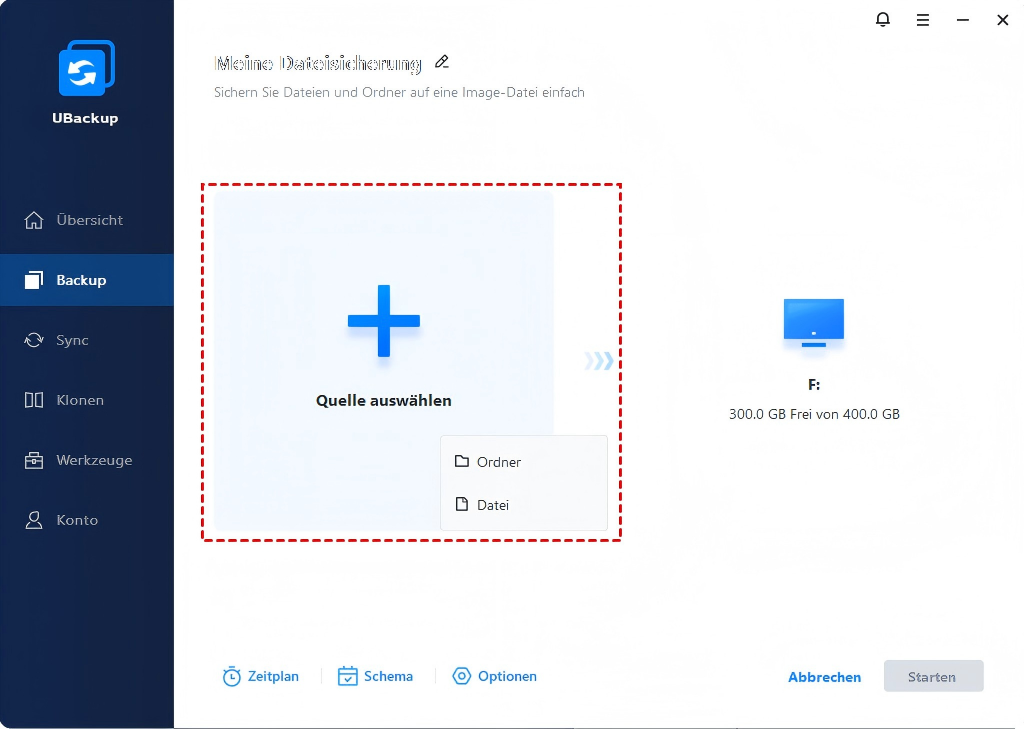 Schritt 2. Klicken Sie auf + Datei oder + Ordner, um die Dateien oder Ordner auszuwählen, die Sie sichern möchten.