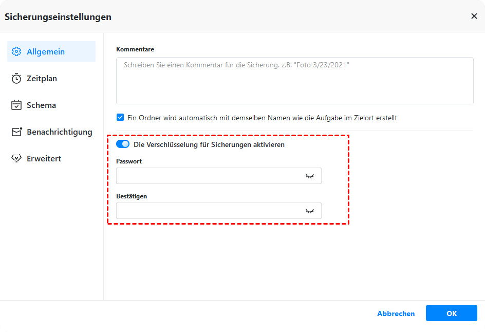 Schritt 4. Um die spezifischen Dateien auf der Festplatte zu schützen, klicken Sie einfach auf Optionen unten und dann auf Allgemein > Die Verschlüsselung für Sicherungen aktivieren. Geben Sie dann das Passwort ein, bestätigen Sie es und klicken Sie auf OK, um Ihre Festplatte zu verschlüsseln.