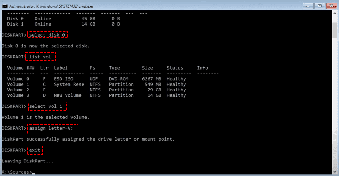 - Geben Sie die folgende Zeile ein und drücken Sie die Eingabetaste, um diesem Volume einen Laufwerksbuchstaben neu zuzuweisen: (V kann durch jeden anderen Buchstaben ersetzt werden, der von den anderen Volumes nicht verwendet wurde.)