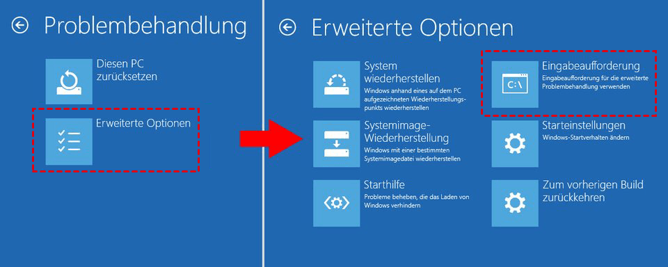Schritt 2. Navigieren Sie zu Computerreparaturoptionen → Problembehandlung → Erweiterte Optionen → Eingabeaufforderung.