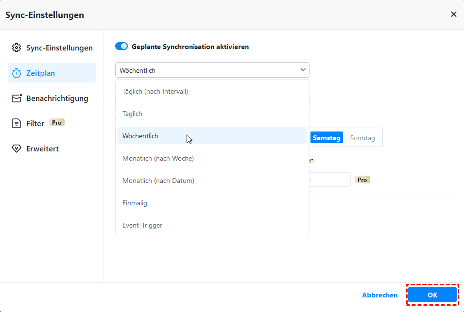 4. Um eine geplante Synchronisierung einzurichten, klicken Sie auf Zeitplan.
