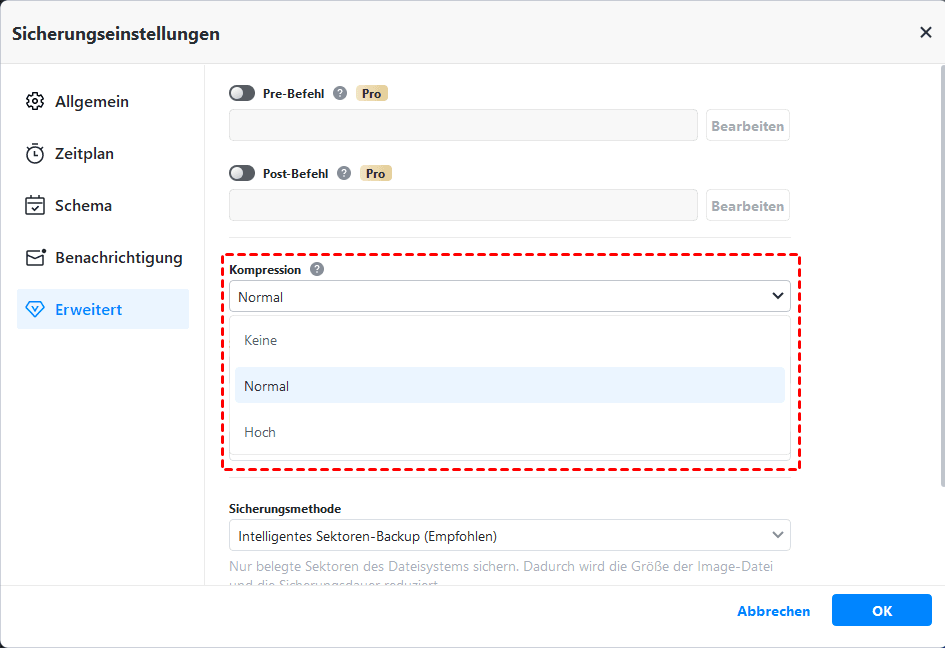 Wenn Sie begrenzten Speicherplatz auf Ihrem Gerät haben, sollten Sie in den Optionen-Einstellungen den Kompressionsgrad des Backup-Images auf Hoch einstellen. Dadurch wird die Größe des Backups optimiert und kleinere Speichergeräte können genutzt werden.