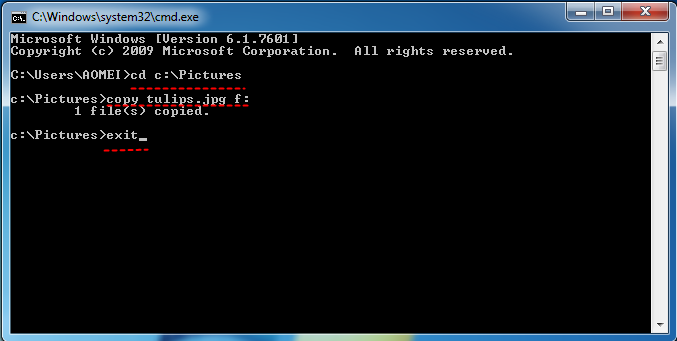 4. Geben Sie copy tulips.jpg f: ein und drücken Sie die Eingabetaste. „tulips.jpg“ gibt den Dateinamen mit der Dateierweiterung an und „f:“ ist der Laufwerksbuchstabe der SD-Karte.