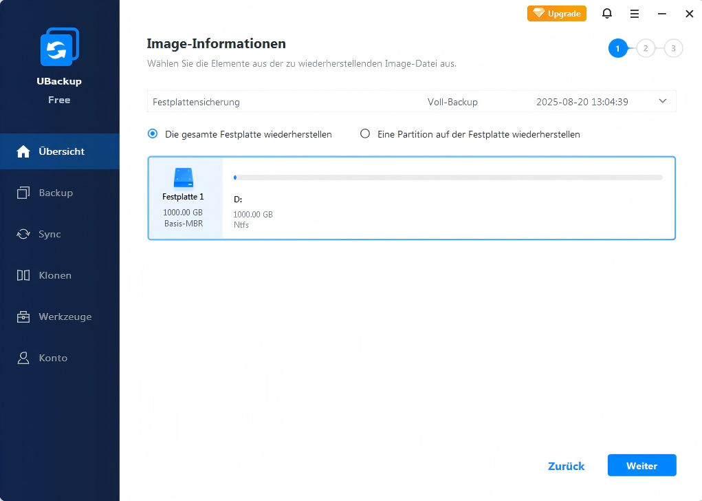 2. Sie sehen das geladene UBackup, sobald das Gerät erfolgreich hochgefahren ist. Klicken Sie auf Übersicht > Wiederherstellen > Zu wiederherstellendes Image auswählen.