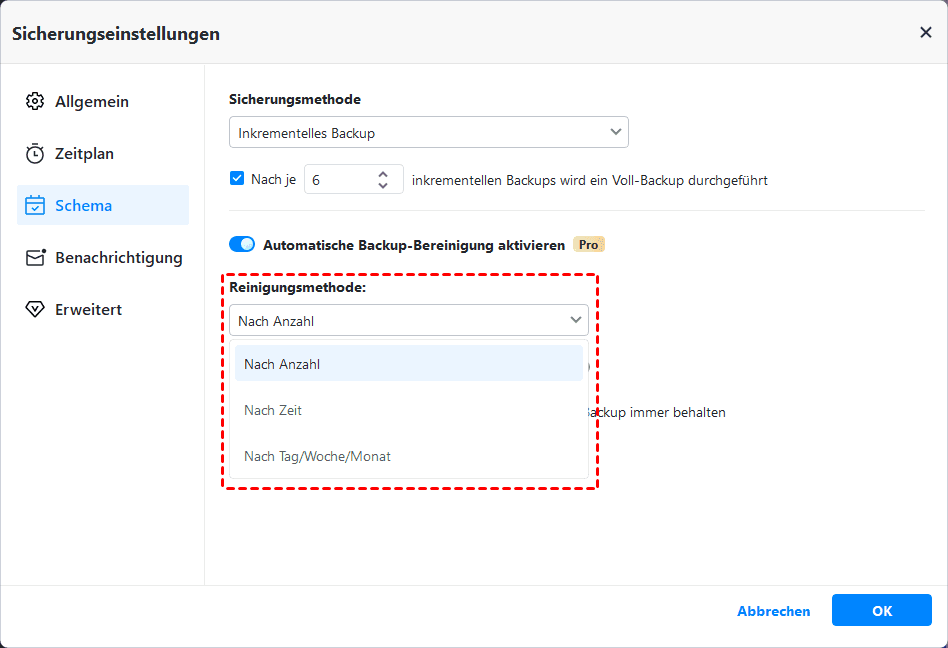 - Backup-Schema: Wählen Sie die Sicherungsmethode (voll, inkrementell oder differentiell), aktivieren Sie die automatische Backup-Bereinigung, um ältere Backups automatisch zu löschen.