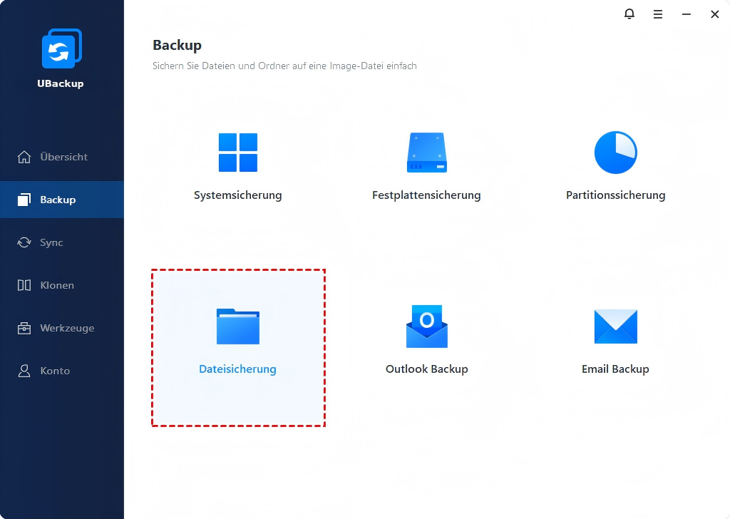Schritt 1. Wählen Sie entweder Dateisicherung, um einzelne Dateien zu sichern, oder Festplattensicherung, um eine Sicherung der gesamten Festplatte zu erstellen.