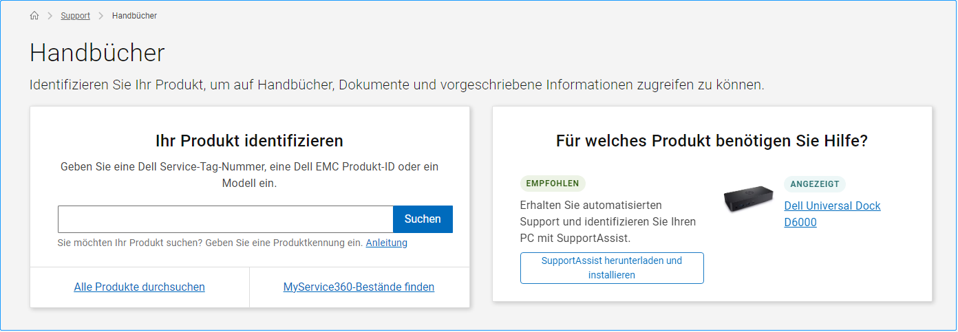 Schritt 2. Giben Sie die Service-Tag-, Express-Service-Codenummer oder Seriennummer des Dell Computers in das dafür vorgesehene Feld ein und klicke auf Suchen. Wenn Sie nicht sicher sing, wo Sie die Dell Service-Tag/Seriennummer finden können, lesen diese hilfreiche Anleitung. Alternativ können Sie auf Alle Produkte durchsuchen klicken und dein spezifisches Dell-Produkt aus den Ergebnissen auswählen.