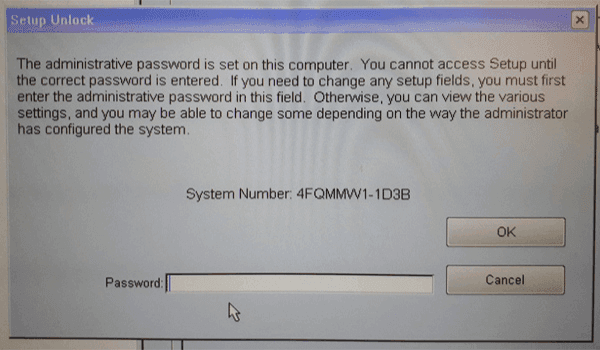 Schritt 5. Kehren Sie zum Dell Setup Unlock-Bildschirm zurück und geben Sie das von der Website bios pw org erhaltene Passwort ein. Drücken Sie Strg + Eingabe, um das Administratorpasswort zu löschen. Wenn alles gut geht, sollten Sie das Dell BIOS-Passwort umgehen können und Änderungen an den BIOS-Einstellungen vornehmen können.