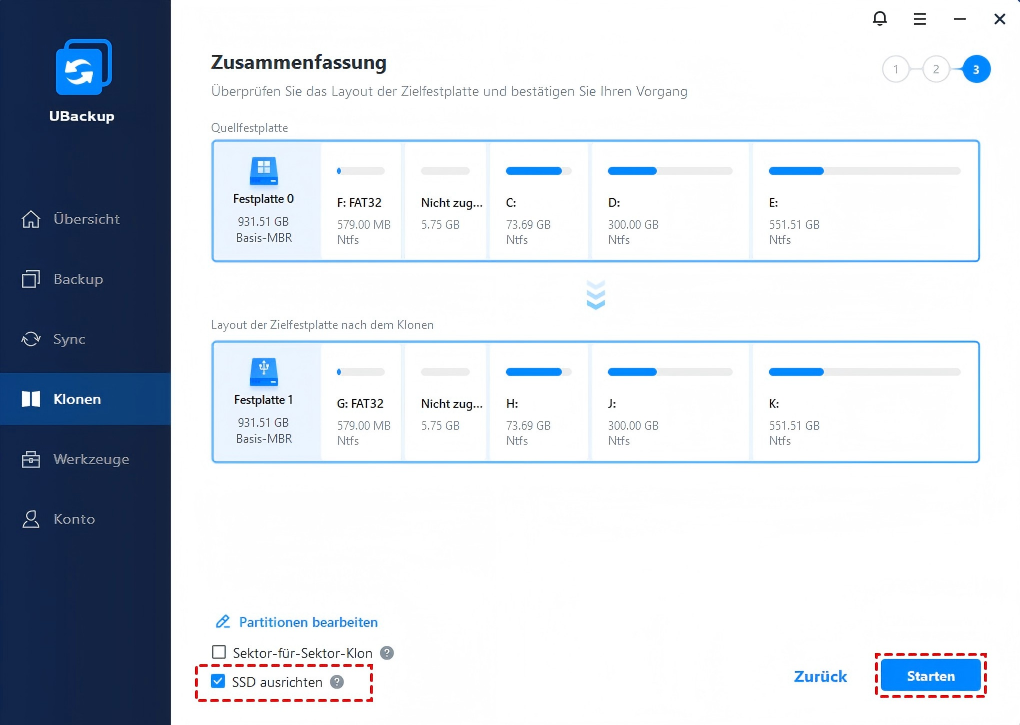 4. Bestätigen Sie dann die Betriebssumme und klicken Sie auf Starten, um den Klonvorgang zu starten. Wenn Ihre Zielfestplatte eine SSD ist, vergessen Sie nicht, die Option SSD ausrichten zu überprüfen, mit der Sie die Schreib- und Lesegeschwindigkeit von SSD-Festplatten verbessern können.
