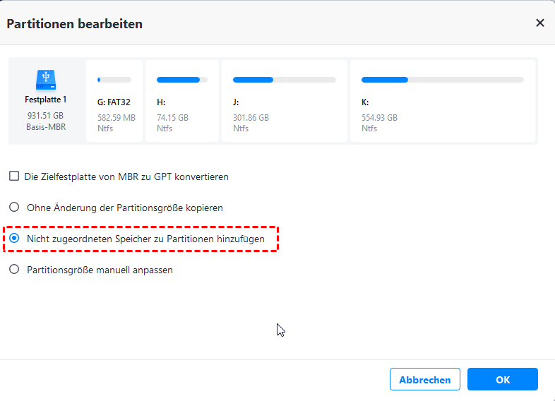 Tipp✍: Partitionen bearbeiten: Diese Funktion ist sehr nützlich, wenn Sie eine Festplatte auf eine größere Festplatte klonen. Es kann Ihnen helfen, die Partitionsgröße der Zielfestplatte anzupassen und ungenutzten Speicherplatz nach dem Klonen zu vermeiden.