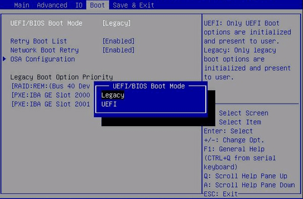 2. Verwenden Sie die linke oder rechte Maustaste, um zum Boot-Tab zu navigieren, und ändern Sie den Boot-Modus auf den Typ, der für Ihre Startpartition festgelegt ist. Wenn die Partitionstabelle auf MBR festgelegt ist, sollten Sie Legacy BIOS auswählen. Wenn die Partition auf GPT festgelegt ist, wählen Sie den UEFI-Startmodus.
