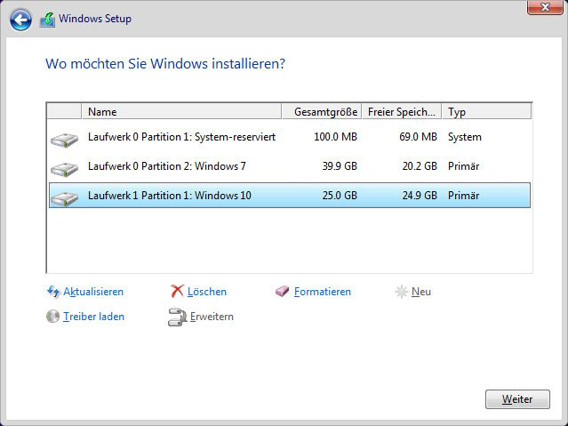 Wenn die Festplatte, auf der Sie Windows 10 installieren möchten, viele Partitionen hat, müssen Sie alle Partitionen löschen, bis die Festplatte nur noch als nicht zugewiesener Speicherplatz angezeigt wird. Wenn beispielsweise Laufwerk 1 ausgewählt ist, wählen Sie Partition 1 von Laufwerk 1 aus, klicken Sie auf Löschen oder Formatieren und klicken Sie auf Weiter.