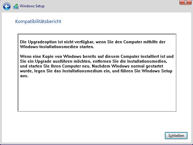 „Ich habe meinen Computer bereits gereinigt und muss ihn nur noch installieren. Aber jedes Mal, wenn ich es versuche, erscheint ein Text, der besagt: ‚Kompatibilitätsbericht: Die Upgradeoption ist nicht verfügbar, wenn Sie den Computer mithilfe der Windows-Installationsmedien starten. Wenn eine Kopie von Windows bereits auf diesem Computer installiert ist und Sie ein Upgrade ausführen möchten, entfernen Sie die Installationsmedien, und starten Sie Ihren Computer neu. Nachdem Windows normal gestartet wurde, legen Sie das Installationsmedium ein, und führen Sie Windows Setup aus.‘