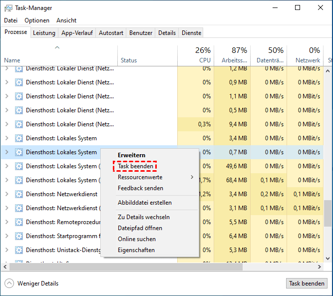 Drücken Sie Ctrl+Shift+Del (Strg+Umschalt+Entf), um den Task-Manager zu öffnen. Suchen Sie Ihren Wechseldatenträger unter der Registerkarte Prozesse, klicken Sie mit der rechten Maustaste und wählen Sie Task beenden.