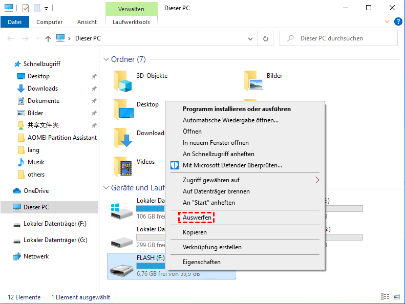 Doppelklicken Sie auf „Dieser PC“ und dann klicken Sie mit der rechten Maustaste auf Ihren Wechseldatenträger. Wählen Sie Auswerfen, um den Wechseldatenträger zu entfernen.