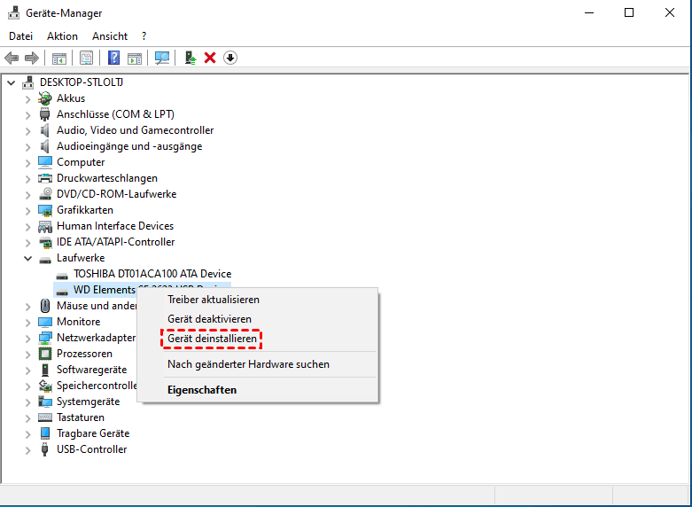 2. In der Geräteliste finden Sie die Kategorie Laufwerke, klicken Sie darauf, um sie zu erweitern. Suchen Sie dann den Wechseldatenträger, den Sie entfernen möchten, klicken Sie mit der rechten Maustaste darauf und wählen Sie Gerät deinstallieren. Versuchen Sie nach Abschluss der Deinstallation erneut, ob sich das Wechselmedium aus dem Computer auswerfen lässt.