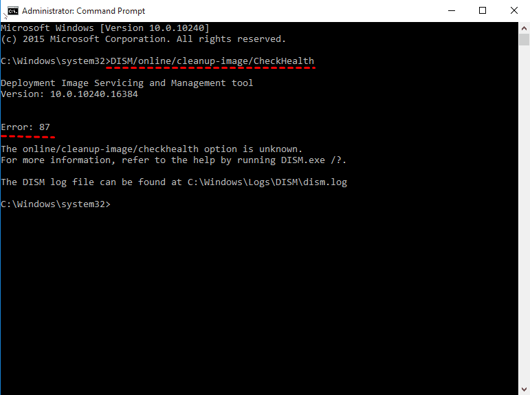 DISM-Fehler 87: Der Parameter ist falsch. Dies kann auf einen kleinen Fehler zurückzuführen sein, z. B. die Eingabe eines falschen Befehls bei Verwendung von DISM /CheckHealth or DISM /ScanHealth. Stellen Sie daher zunächst sicher, dass Sie den richtigen Befehl eingeben.