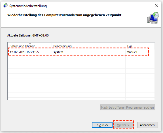 Schritt 3. Wählen Sie den Wiederherstellungspunkt in der Liste aus und klicken Sie auf Weiter.