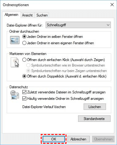 3. Stellen Sie im Fenster „Ordneroptionen“ sicher, dass Sie sich im Reiter „Allgemein“ befinden und wählen Sie die Option „Öffnen durch Doppelklick (Auswahl d. einfachen Klick)“. Klicken Sie dann auf „OK“, um Ihre Änderungen zu speichern.