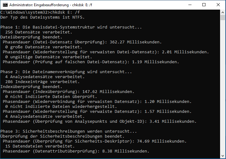 Schritt 2. Prüfen Sie, ob Ihr Laufwerk fehlerhafte Sektoren hat. Geben Sie in der Eingabeaufforderung chkdsk E: /f ein und drücken Sie die Eingabetaste. In diesem Befehl bezieht sich E auf den Laufwerksbuchstaben Ihres USB-Geräts.