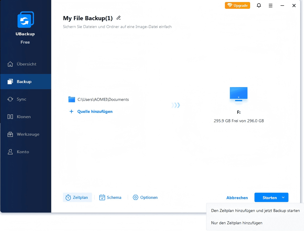 Schritt 3. Klicken Sie auf Optionen, Zeitplan, Schema, um das Backup zu verwalten, falls erforderlich. Starten Sie anschließend die Sicherung, um Dateien zu sichern.