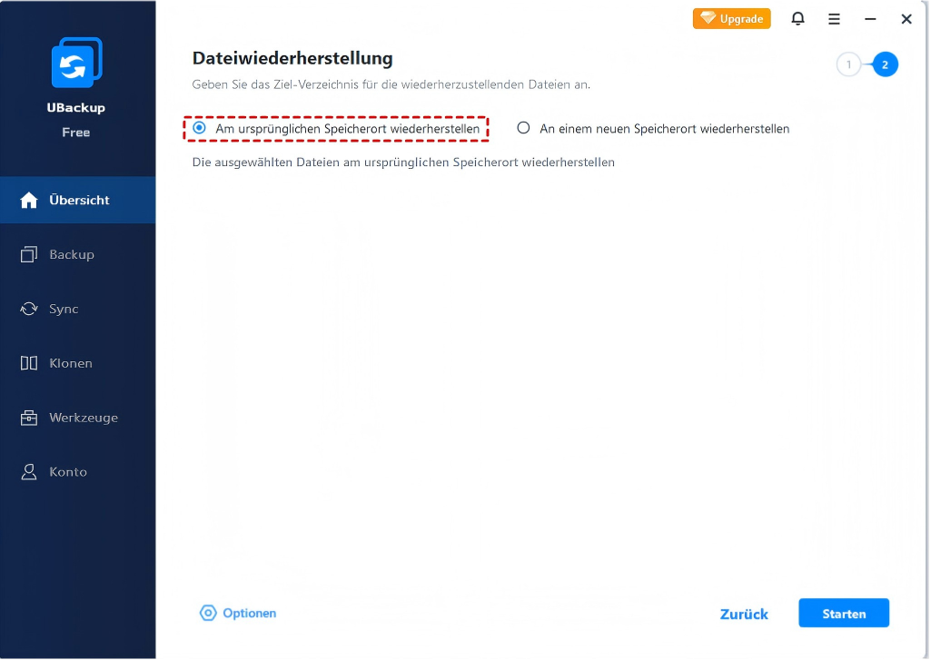 Schritt 4. Wählen Sie Am ursprünglichen Speicherort wiederherstellen. Klicken Sie auf Starten und warten Sie, bis der Vorgang abgeschlossen ist.