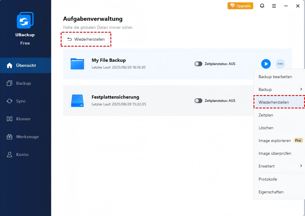 Im Vergleich zum integrierten Dienstprogramm von Windows kann eine kostenlose Sicherungs- und Wiederherstellungssoftware flexiblere Lösungen zum Schutz Ihrer Daten auf dem USB anbieten. UBackup Free ist ein Beispiel dafür. Damit können Sie alle Arten von Dateien von verschiedenen Speichergeräten sichern, einschließlich Speicherlaufwerken, SD-Karten, externen Festplatten, SSD-Laufwerken, Cloud-Laufwerken usw., und sie bei Bedarf an jedem beliebigen Ort wiederherstellen.