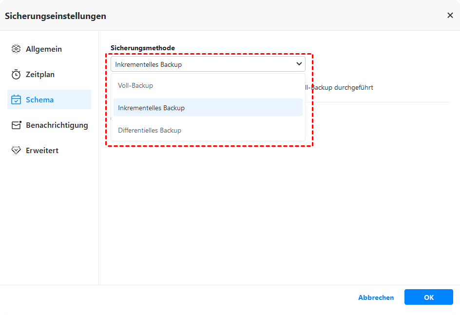 ✩ Schema: Sie können auf Schema in der unteren linken Ecke klicken, um die Sicherungsmethode anzupassen (Voll-Backup inkrementelles Backup, differentielles Backup), und wenn es sich um die professionelle Version handelt, können Sie auch die automatische Sicherungsbereinigungsfunktion aktivieren.