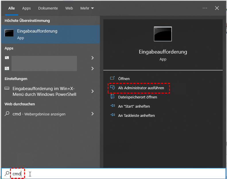 - Geben Sie cmd in die Suchleiste der Taskleiste ein und wählen Sie im rechten Fenster Als Administrator ausführen.