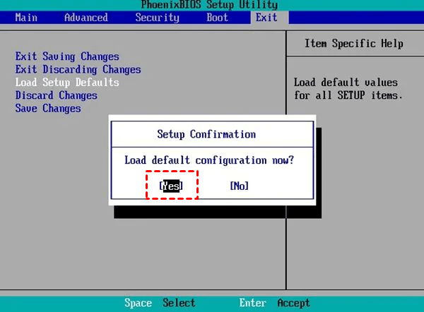 - Nehmen wir mein BIOS-Interface als Beispiel, klicken Sie auf die Option Load Setup Defaults und klicken Sie im Bestätigungsfenster auf Yes, um das BIOS auf die Werkseinstellungen zurückzusetzen.