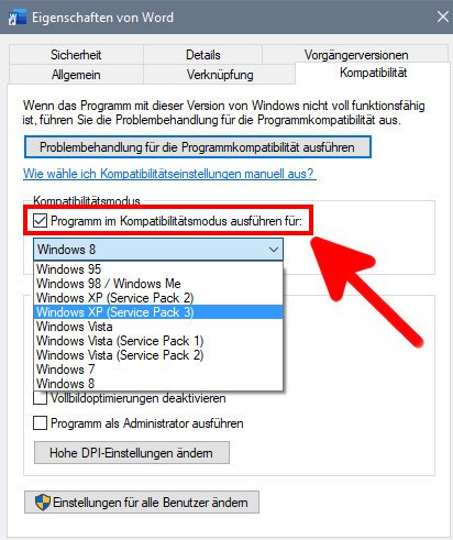 - Wechseln Sie zum Tab Kompatibilität oben und aktivieren Sie das Kontrollkästchen Programm im Kompatibilitätsmodus ausführen für. Wählen Sie das entsprechende Windows-System entsprechend Ihrem Computer aus und klicken Sie abschließend auf Übernehmen und dann auf OK.