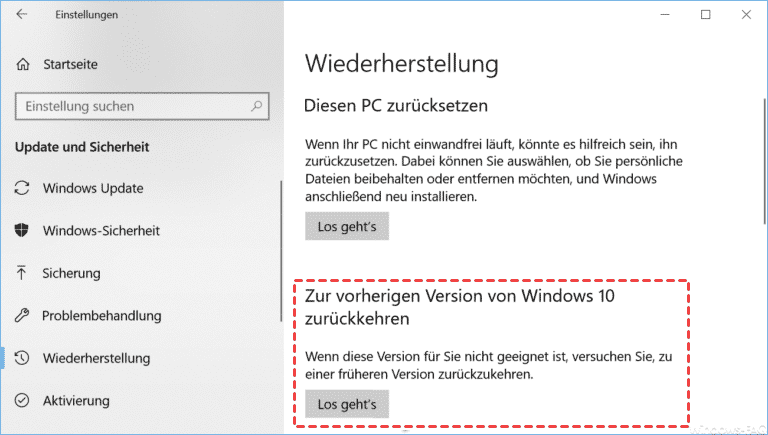 Öffnen Sie das Fenster Update und Sicherheit und wechseln Sie auf der linken Seite zum Tab Wiederherstellung. Klicken Sie im rechten Fenster auf Los geht's und folgen Sie dann den Anweisungen, um Ihren Computer neu zu starten.