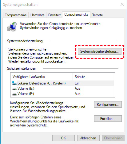 - Klicken Sie auf die Schaltfläche Systemwiederherstellung... im Tab Computerschutz des Fensters Systemeigenschaften.