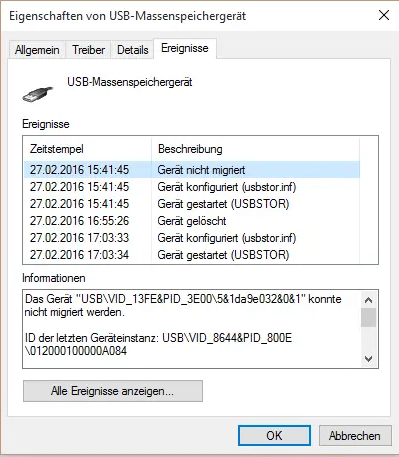 - Dann können Sie die Fehlermeldung unter dem Register Ereignisse finden.