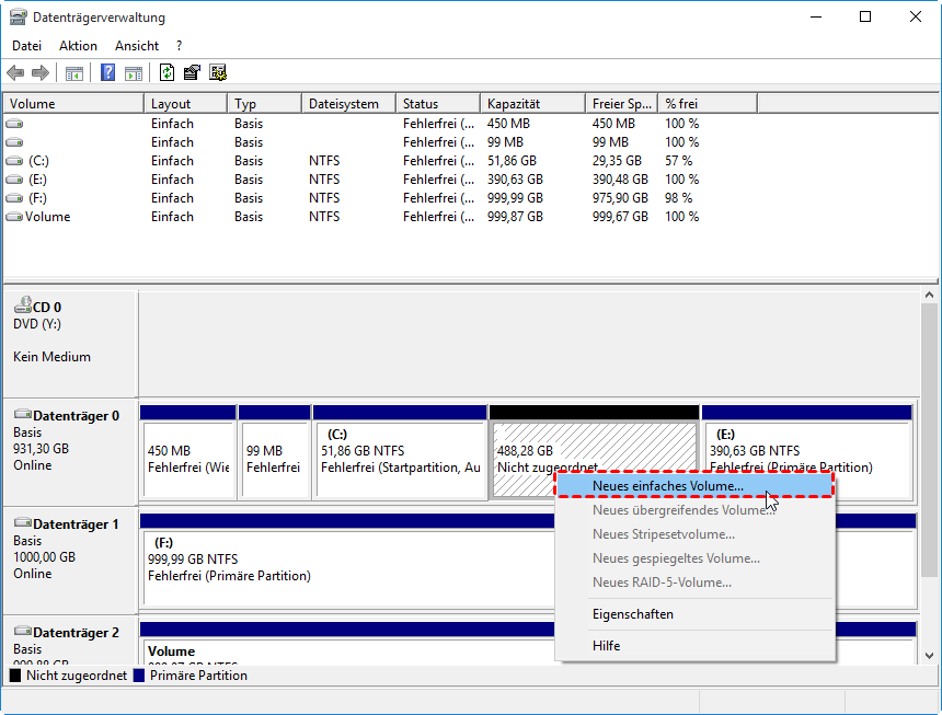 - Klicken Sie mit der rechten Maustaste auf das Nicht zugeordnete externe Festplattenvolumen, wählen Sie im erweiterten Menü Neue einfache Volume aus, und folgen Sie den Anweisungen zur Partitionierung.