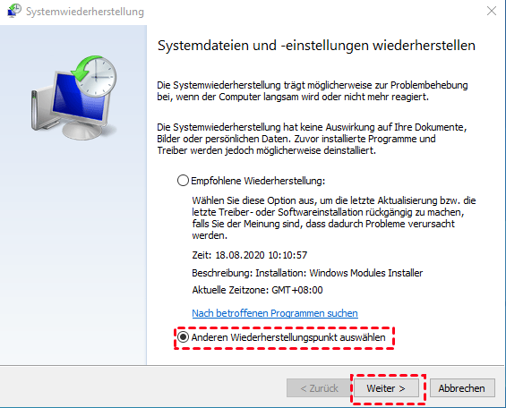 Ein Wiederherstellungspunkt ist ein gespeicherter Zustand des Betriebssystems in einer normalen Betriebskonfiguration, der es Ihnen ermöglicht, das System auf einen Zeitpunkt vor dem Auftreten des Fehlers zurückzusetzen. Beachten Sie, dass diese Methode erfordert, dass Sie zuvor einen Systemwiederherstellungspunkt festgelegt haben, da Fehler sonst nicht mit dieser Methode behoben werden können.