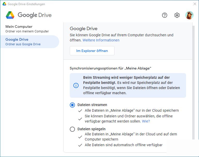 Schritt 1. Gehen Sie zu dem Google Drive-Ordner auf Ihrem Computer oder öffnen Sie den Ordner, indem Sie in der Google Drive-Desktop-App auf Im Explorer öffnen klicken.