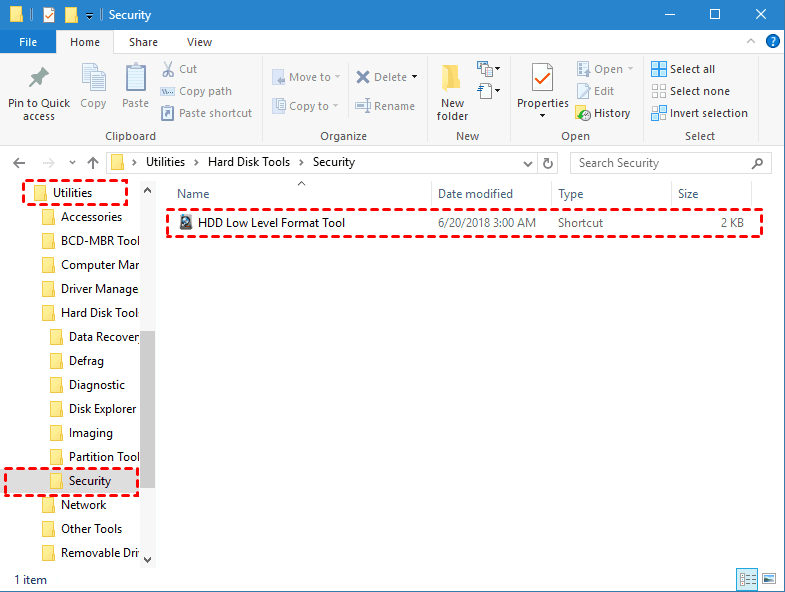 1. Öffnen Sie im Boot CD-Menü von Hiren den Ordner Dienstprogramme und gehen Sie zu Utilities → Hard Disk Tools → Security. Doppelklicken Sie dann auf HDD Low Level Format Tool.
