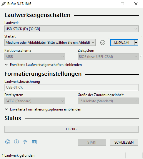 ▣ Wählen Sie den USB-Stick aus dem Dropdown-Menü Laufwerk aus.
