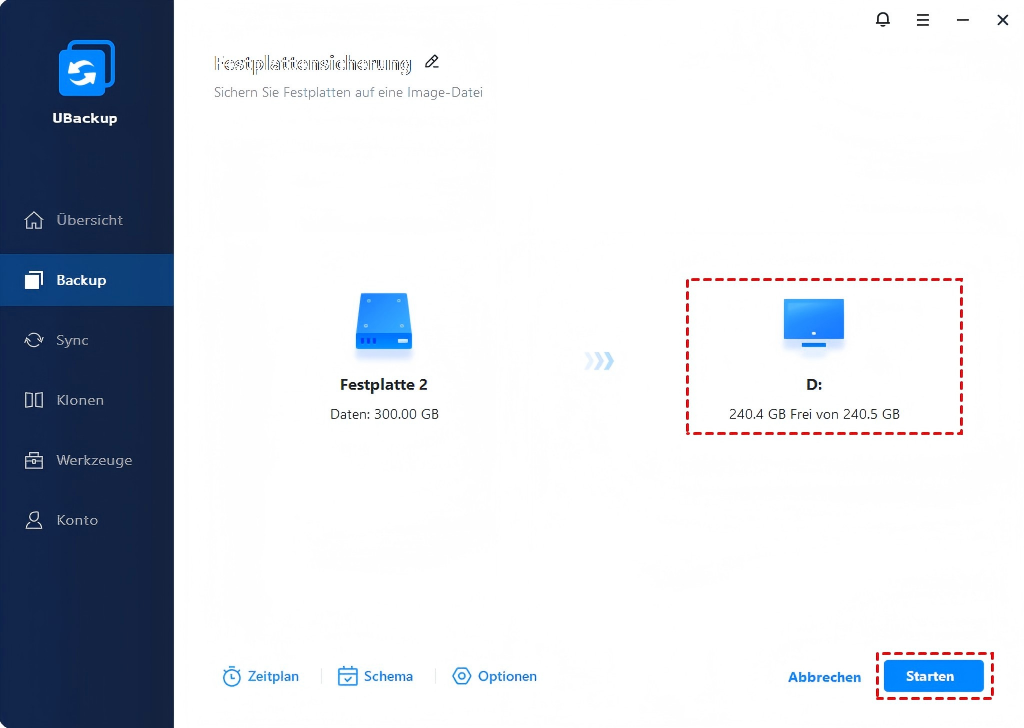 Schritt 3. Wählen Sie ein Ziel zum Speichern der Festplatten-Image-Sicherung. Klicken Sie dann auf die Schaltfläche Starten>>, um ein Festplattenabbild für Windows 11/10/8/7 zu erstellen.