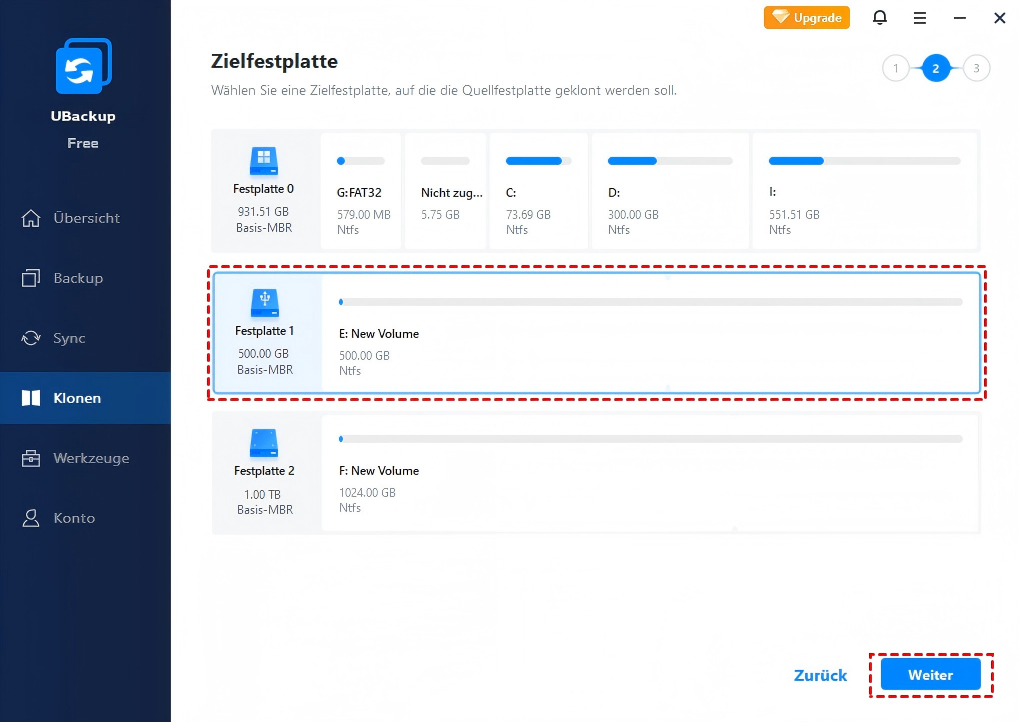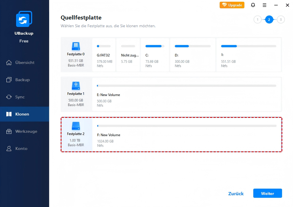3. Wählen Sie die Festplatte, die Sie klonen möchten, und dann die Zielfestplatte.