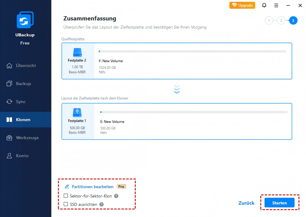 🌓 Intelligenz beim Klonen: Das Klonen größerer Festplatten auf kleinere wird nicht immer unterstützt.
