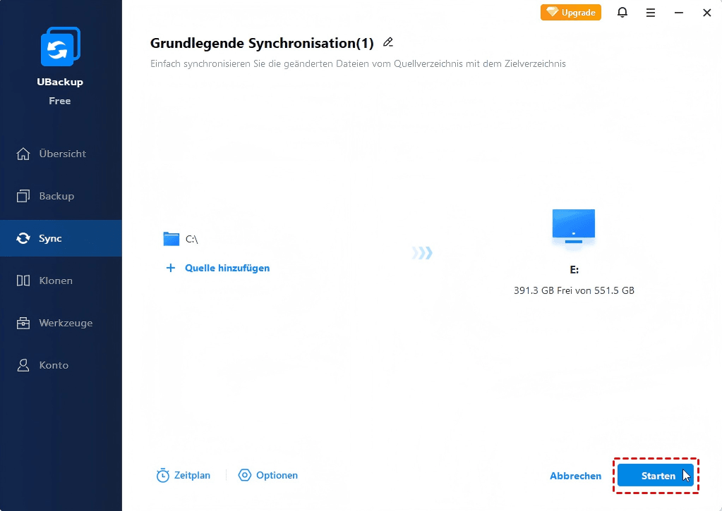 Schritt 5. Klicken Sie auf Starten, um mit der Spiegelung der lokalen Ordner auf die externe Festplatte zu beginnen. Bei Bedarf können Sie über Optionen und Zeitplan weitere Konfigurationen vornehmen.