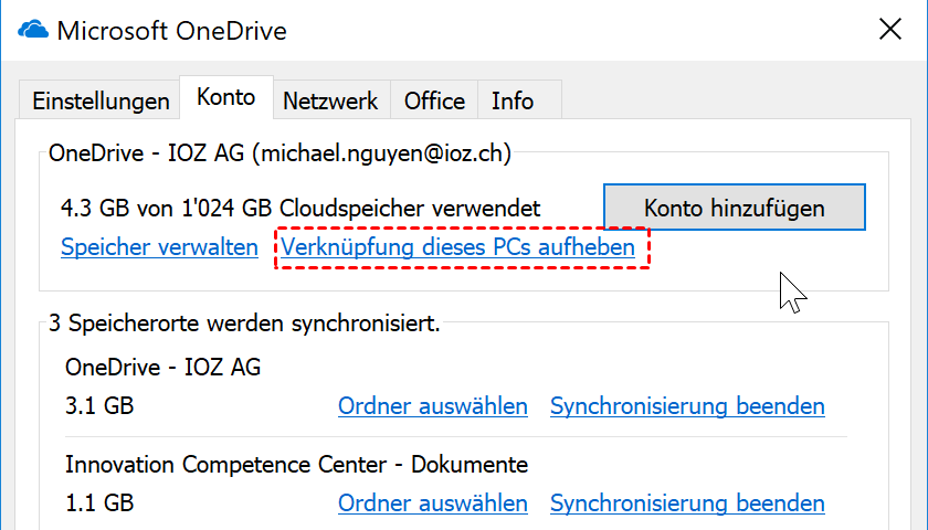 Schritt 3. Gehen Sie zum Tab Konto und klicken Sie auf Verknüpfung dieses PCs aufheben. Es wird ein neues OneDrive-Fenster angezeigt, das Sie schließen können.