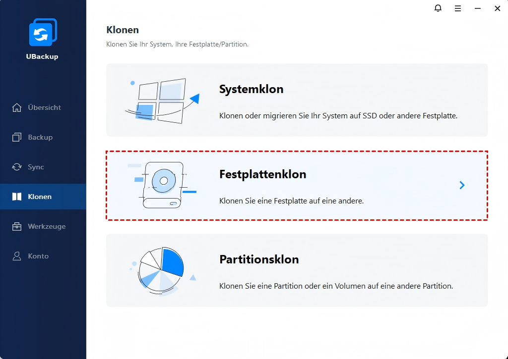 Schritt 1. Wenn Ihr Computer von der Startdiskette neu startet, werden Sie direkt in diese Software eingeloggt. Wählen Sie dann den Reiter Klonen und wählen Sie die Option Festplattenklon aus.